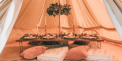 What’s included: 4M bell tent | picnic table | place settings, goblets & silverware | floral arrangement | lighting | rugs | floor cushions
