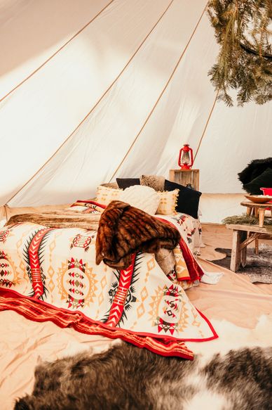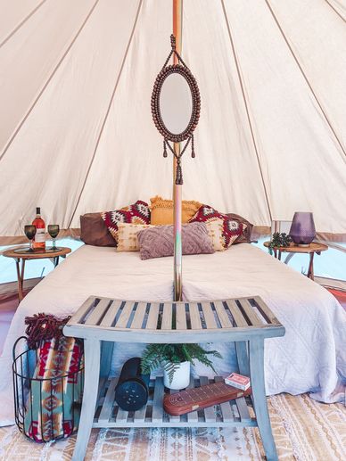What's included: 4M (13ft) bell tent | queen sized air mattress | luxury bedding | side tables & lamps | rugs | bench.