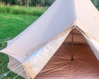 Our 4M (13ft) bell tent can sleep up to four people or seat up to eight.