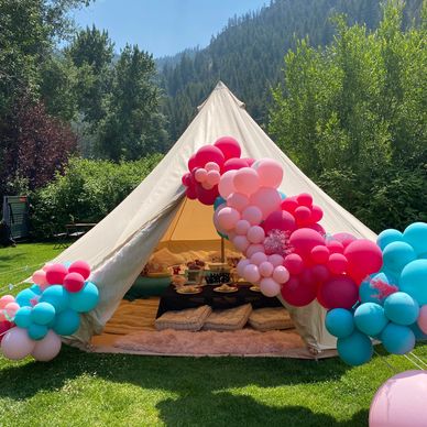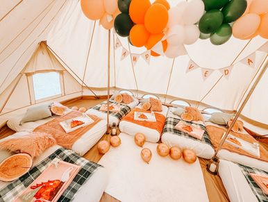 What's included: Emperior bell tent | 10ft balloon garland | up to 10 twin air beds | sheets, blankets and decorative pillows | bed trays | personalized sleep mask | lighting | additional themed decor